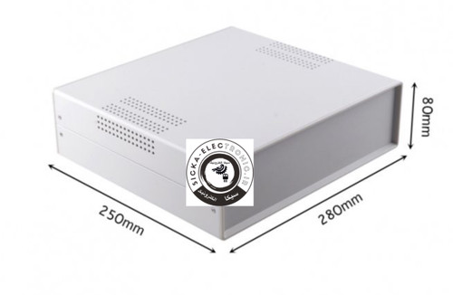 باکس الکترونیکی فلزی با پنل پلاستیکی (سفید یا مشکی با توجه به موجودی) سایز ۲۵ سانتی متر در ۲۸ سانتی متر در ۸ سانتی متر /کیفیت بسیار خوب رنگ و تولید /باکس مناسب اتواع پروژه های الکترونیکی،منبع تغذیه،آمپلی فایر،اینورتر،تغذیه و ...