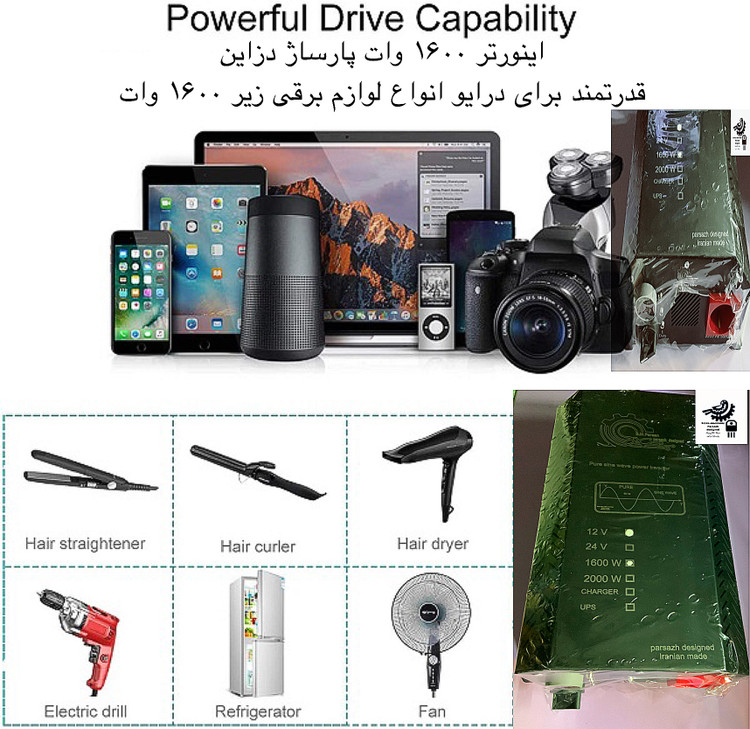 طی تست انجام شده با این اینورتر و مبدل برق اتومبیل ورژن ۱۶۰۰ وات تمام سینوسی برند اس ام پارسان(پارساژ) با چند نمونه دریل و مینی فرز و تلویزیون های ال ای دی پهن سایز متوجه قدرت و توانایی این مدل از اینورتر شدیم .