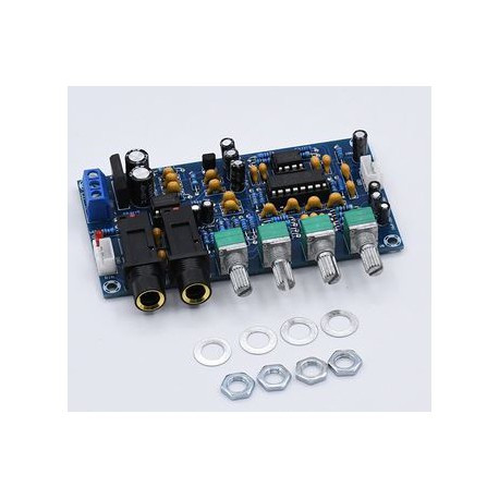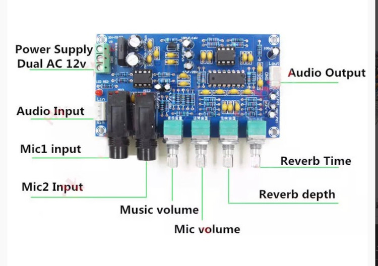 ماژول اکو و پری آمپلی فایر استریو حرفه ای - دارای محدوده ولتاژ ورودی از ۶ ولت الی ۲۰ ولت AC – دوبل است. این محصول دارای ۴ ولوم برای تنظیمات مختلف صدا، ۲ عدد ورودی میکروفن، یک عدد ورودی استریو AUX، یک خروجی استریو و همچنین یک LED روشن و خاموش مدار اکو میباشد.