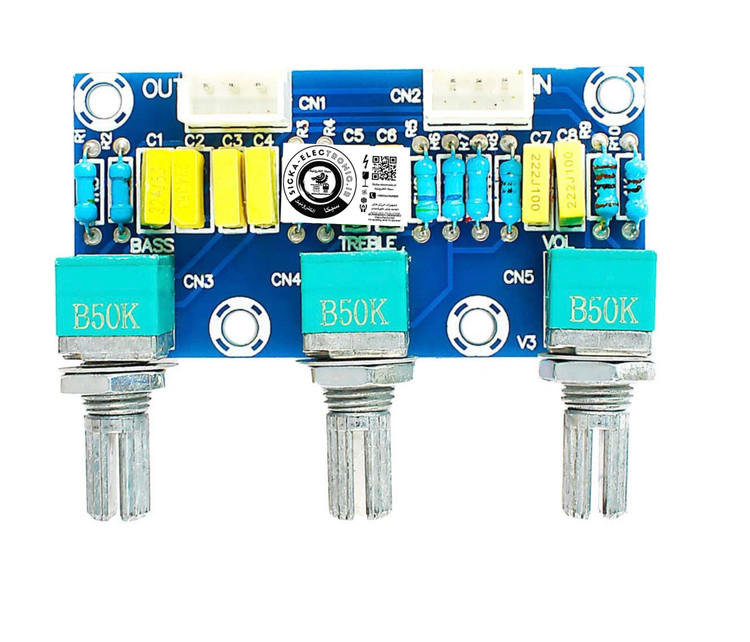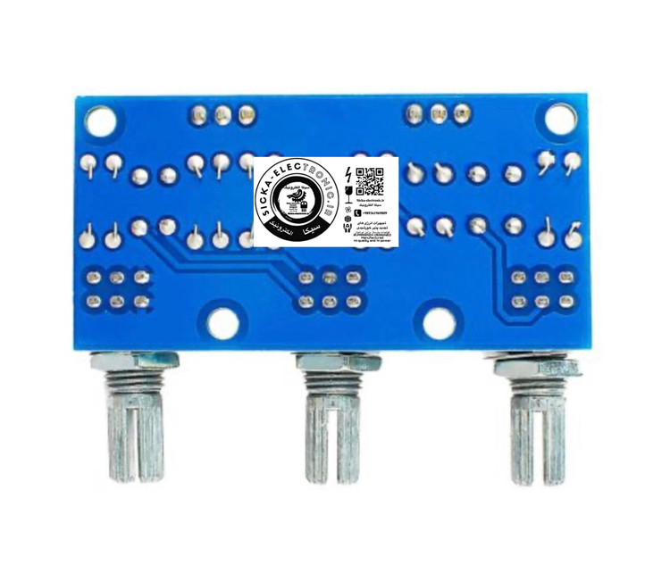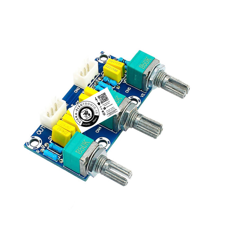یک برد تن کنترل پسیو است که برای تنظیم فرکانسهای بالا و پایین ورودی سیگنال صوتی به کار میرود. این ماژول از طریق فیلتر RC و بدون نیاز به منبع تغذیه کار میکند و قادر است صدای زیر و بم را از طریق خازن RC تنظیم کرده و سپس به برد آمپلی فایر ارسال کند. در نظر داشته باشید که به دلیل ماهیت پسیو بودن، حجم صدای خروجی پس از پردازش کمتر از حالت عادی خواهد بود. این ماژول گزینهای عالی برای علاقهمندان به HiFi و تنظیمات صوتی دستی است.