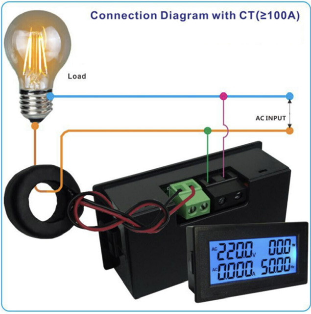 نمایشگر مولتی فانگشن LCD کیفیت بالا تا ۵۰۰ ولت و ۱۰۰ آمپر غیر تخریبی / واتمتر ac مناسب تابلو برق برای مانیتورینگ پنلی چهار پارامتر ثابت و دو پارامتر رندوم شامل ولتمتر ، آمپر متر ، وات متر ،فرکانس شمار ،فی متر و کیلو وات ساعت /به همراه سی تی ترانس
