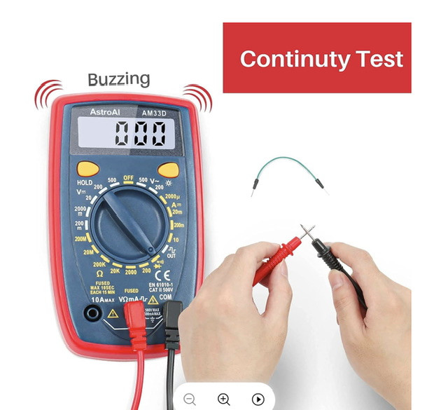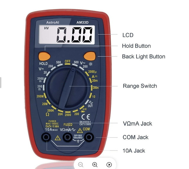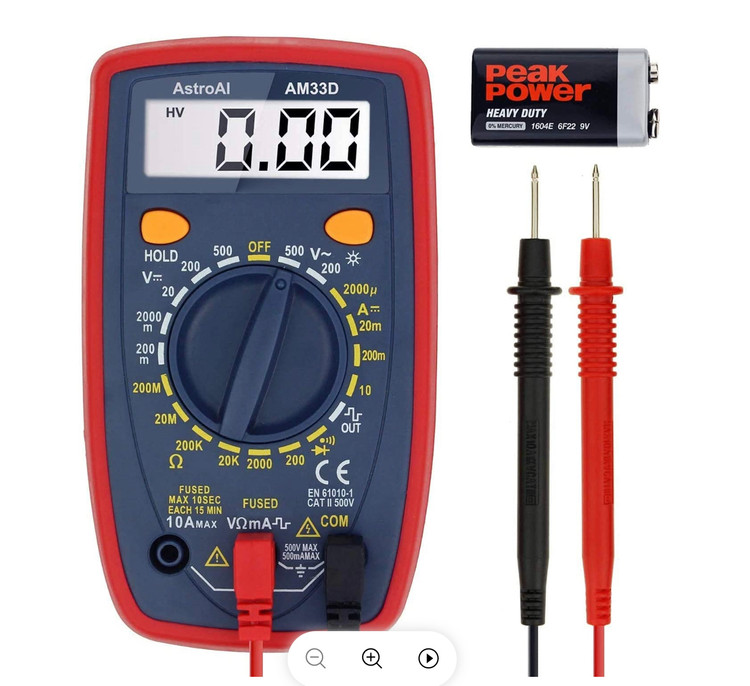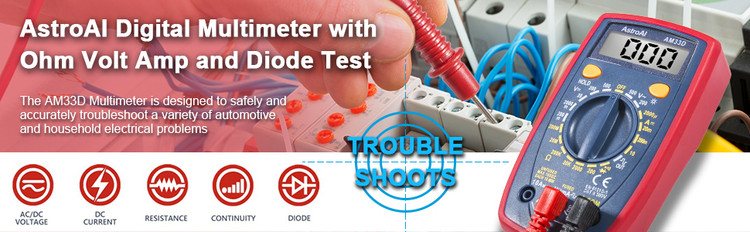 The AstroAI AM33D Multimeter is designed to safely and accurately troubleshoot a variety of automotive and household electrical problems. It's easy and safe to operate and features many different functions for measuring current, voltage, and resistance, as well as continuity, transistor, and diode testing, which is both for automotive and household uses.