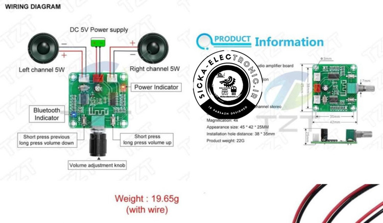 ماژول آمپلی فایر بولوتوثی کوچک -با داشتن خروجی دو کاناله به صورت استریو، دارای ورودی تغذیه 5 ولت DC بوده و از طریق یک ولوم حجم صدا و دو عدد کلید می توانید ماژول را کنترل نمایید. نحوه اتصال و استفاده از این ماژول جذاب در تصاویر نشان داده شده است