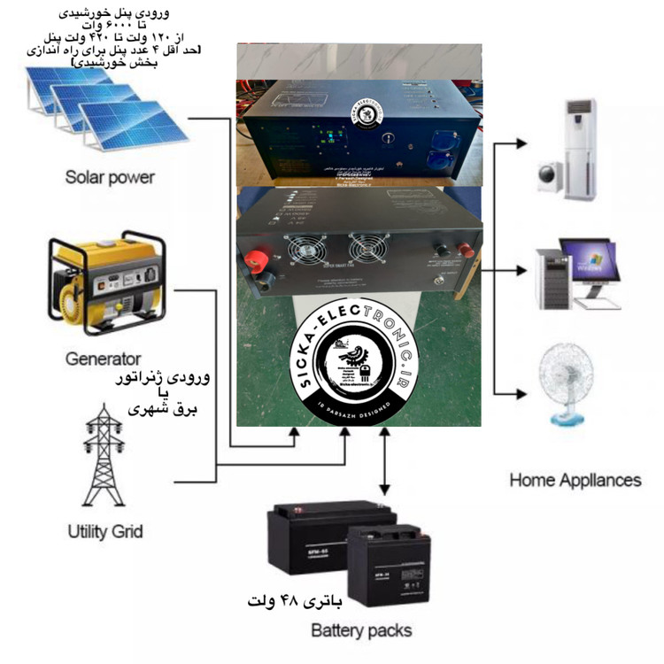 انتخاب خروجی : سوویچ و انتخاب هوشمند خروجی با توجه اتصالات پنل،باتری،برق شهری یا ژنراتور