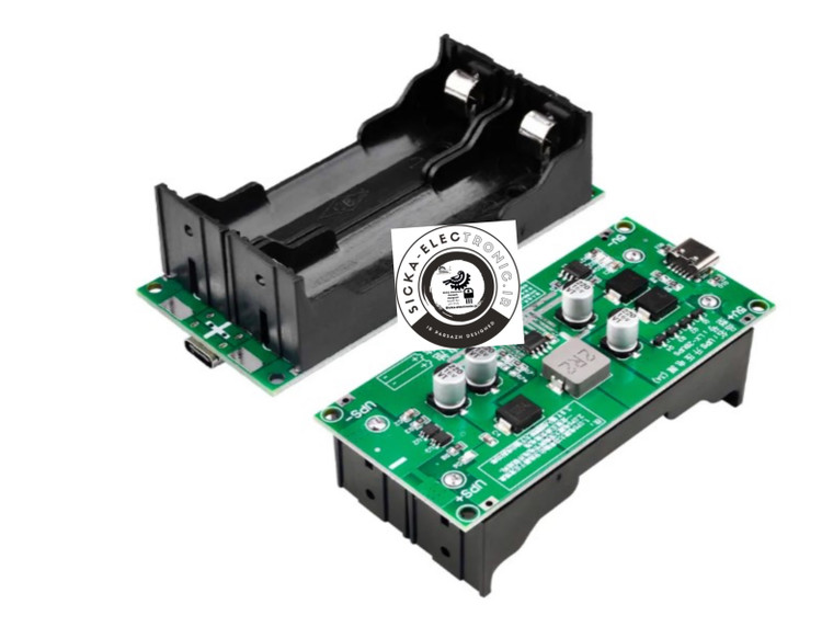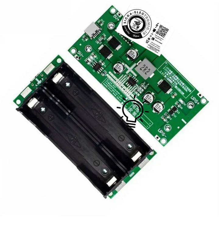 - ماژول مجهز به دو جاباتری سایز 18650، یک پورت شارژ تایپ سی و یا یک ورودی مستقیم 5 ولت DC برای شارژ باتری لیتیومی است.