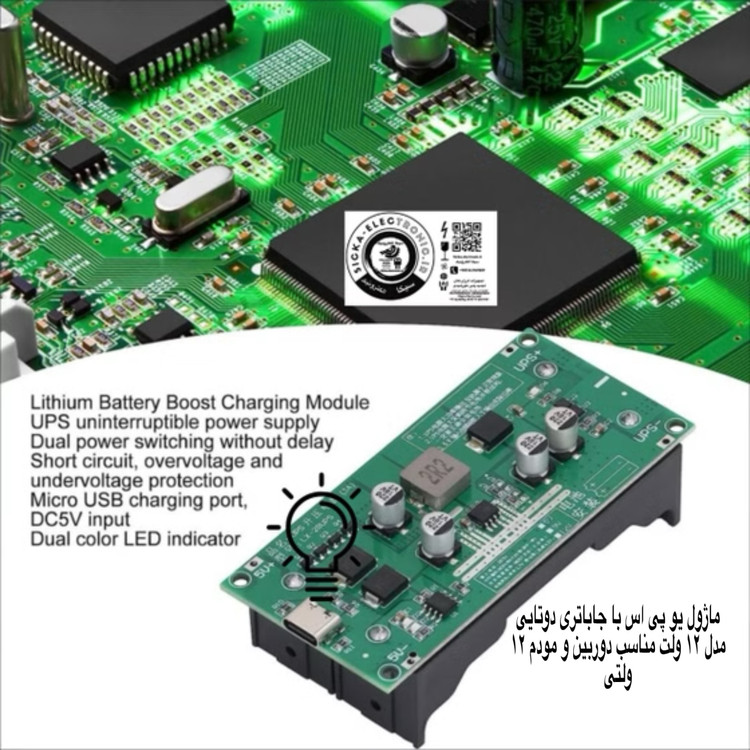 ماژول تغذیه بدون وقفه 12 ولت درواقع مانند یک یو پی اس (UPS) یا برق اظطراری عمل می کند یعنی در حالت عادی باتری هارا شارژ میکند و در حالتی که منبع تغذیه اصلی از مدار خارج می گردد وارد میدان می شود (بدون تاخیر) و با برق رسانی از دو باتری لیتیوم یون 18650 می تواند تغذیه بار را فراهم کند.