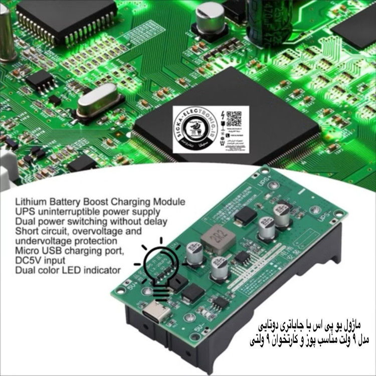 ماژول تغذیه بدون وقفه 9 ولت درواقع مانند یک یو پی اس (UPS) یا برق اظطراری عمل می کند یعنی در حالت عادی باتری هارا شارژ میکند و در حالتی که منبع تغذیه اصلی از مدار خارج می گردد وارد میدان می شود (بدون تاخیر) و با برق رسانی از دو باتری لیتیوم یون 18650 می تواند تغذیه بار را فراهم کند.