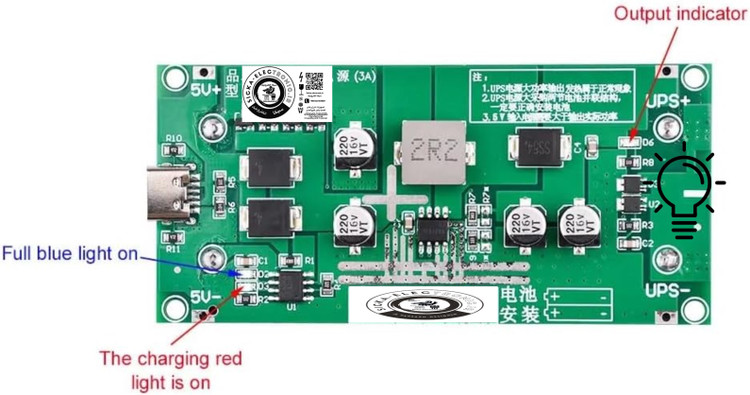 - ماژول مجهز به دو جاباتری سایز 18650، یک پورت شارژ تایپ سی و یا یک ورودی مستقیم 5 ولت DC برای شارژ باتری لیتیومی است.