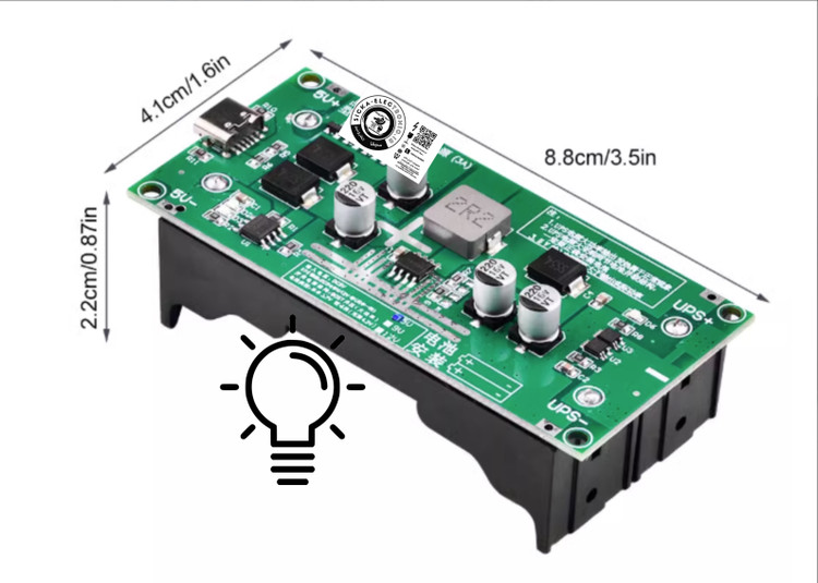 این ماژول یک UPS با ولتاژ خروجی ثابت 9 ولت می باشد که دارای ورودی 5 ولت می باشد که میتوان از طریق کانکتور USB Type-C یا از طریق پدهای 5V+ و 5V- به ماژول اعمال کرد. و از طرف دیگر ورودی باتری لیتیومی 3.7 ولتی را دارد که در پشت برد دارای یک قاب باتری دو عددی می باشد که که دو عدد باتری 18650 سر تخت به صورت موازی در آن قرار می گیردو