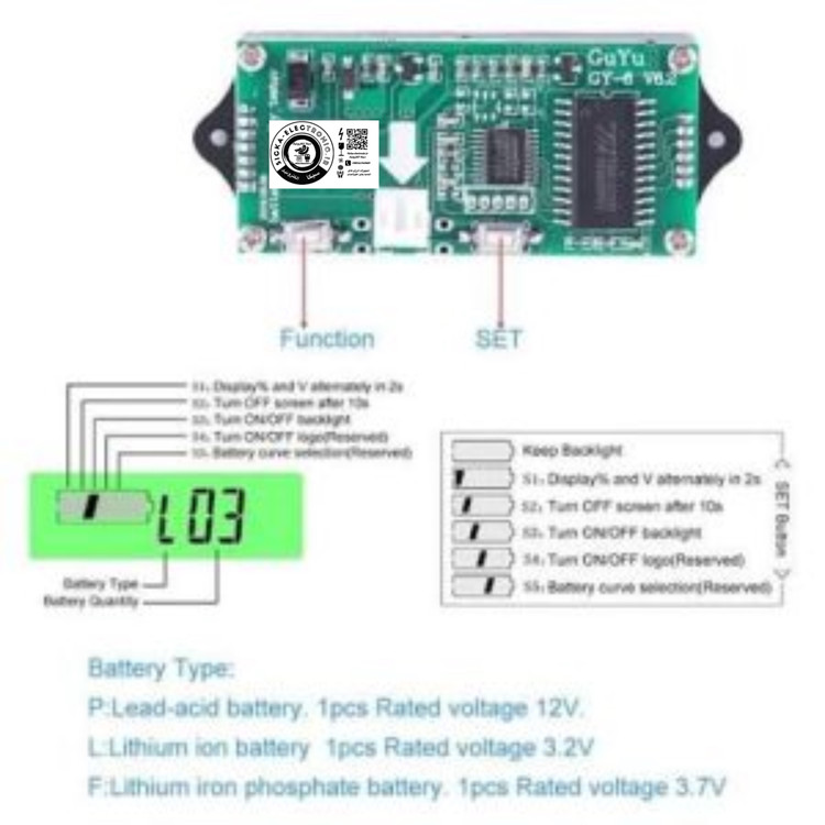 - تنظیمات نمایشگر: زمانی که در مد تنظیمات هستید با نگه داشتن دکمه Function وارد تنظیمات نمایشگر میشویم بطوریکه اگر S1 فعال باشد % و ولتاژ به ترتیب دو ثانیه یک بار نمایش داده میشوند و اگر خاموش باشد فقط % نمایش داده میشود، چنانچه S2 فعال باشد نمایشگر با تاخیر 10 ثانیه خاموش میشود و در صورتی که غیرفعال باشد نمایشگر دائما روشن میماند و S3 برای خاموش و روشن کردن Back Light استفاده میشود.