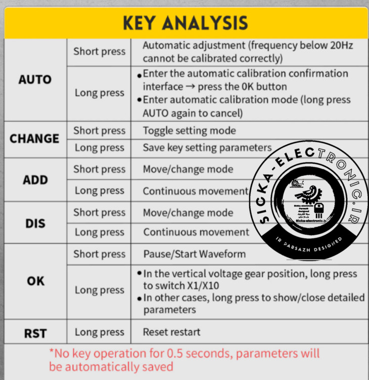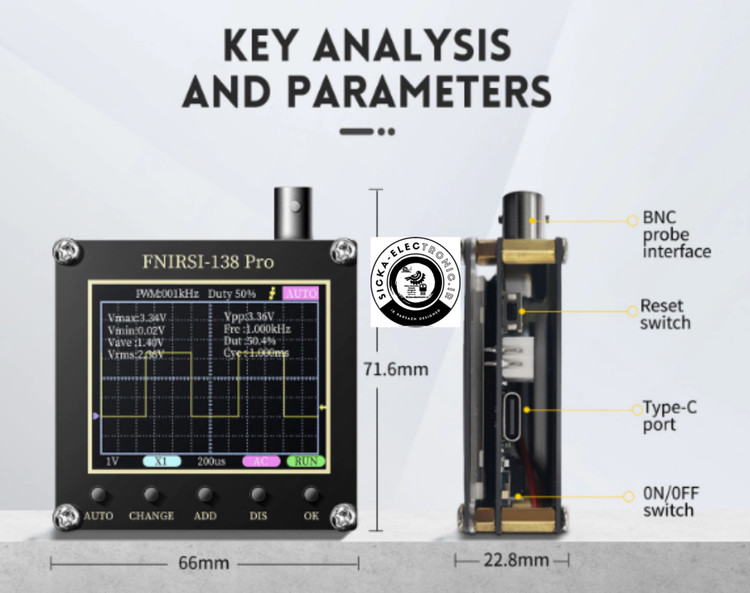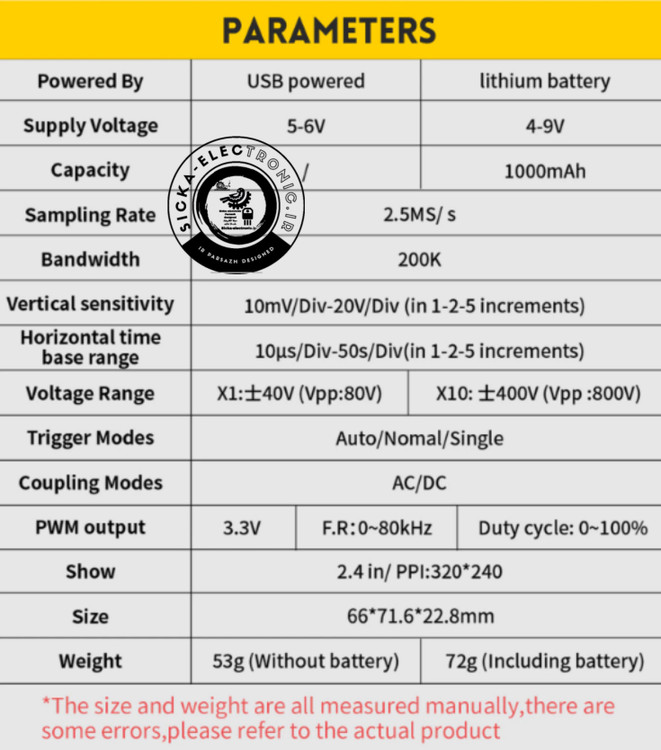 این اسیلوسکوپ دستی دارای نرخ نمونه برداری بلادرنگ 2.5MS/s و پهنای باند 200KHz است.